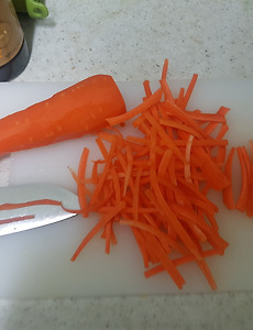 책읽는 것도 지치고 할게 없어서, 궁중떡볶이를 만들어보았다. 요리 포스트를 처음 작성해보는데, 요리하랴 사진찍으랴 보통일이 아니더라.누락된 사진들은 설명으로 대체한다. 재료: 당근 반개, 양파 반개, 얼린 파 반주먹, 간마늘 한 스푼, 떡볶이 떡 한팩 (2,500원), 냉동 청양고추 1/2개, 납작 당면 15가닥 정도, 소고기 한주먹 (부위 모름, 남는거)양념: 간장 4스푼 + 에리스리톨(설탕 대체제) 2 스푼, 참기름 2스푼, 미림(맛술) 1/2스푼 이제 요리 시작 당근을 얇게 채썰어 준다. 양파 반개도 얇게 썰어준다.냉동실에 있던 파도 대충 뜯어서 준비해둔다. 양념: 간장 4스푼 + 에리스리톨(설탕 대체제) 2 스푼, 참기름 2스푼, 미림(맛술) 1/2스푼위 양념을 전부 섞고, 고기를 양념에 묻혀둔다..